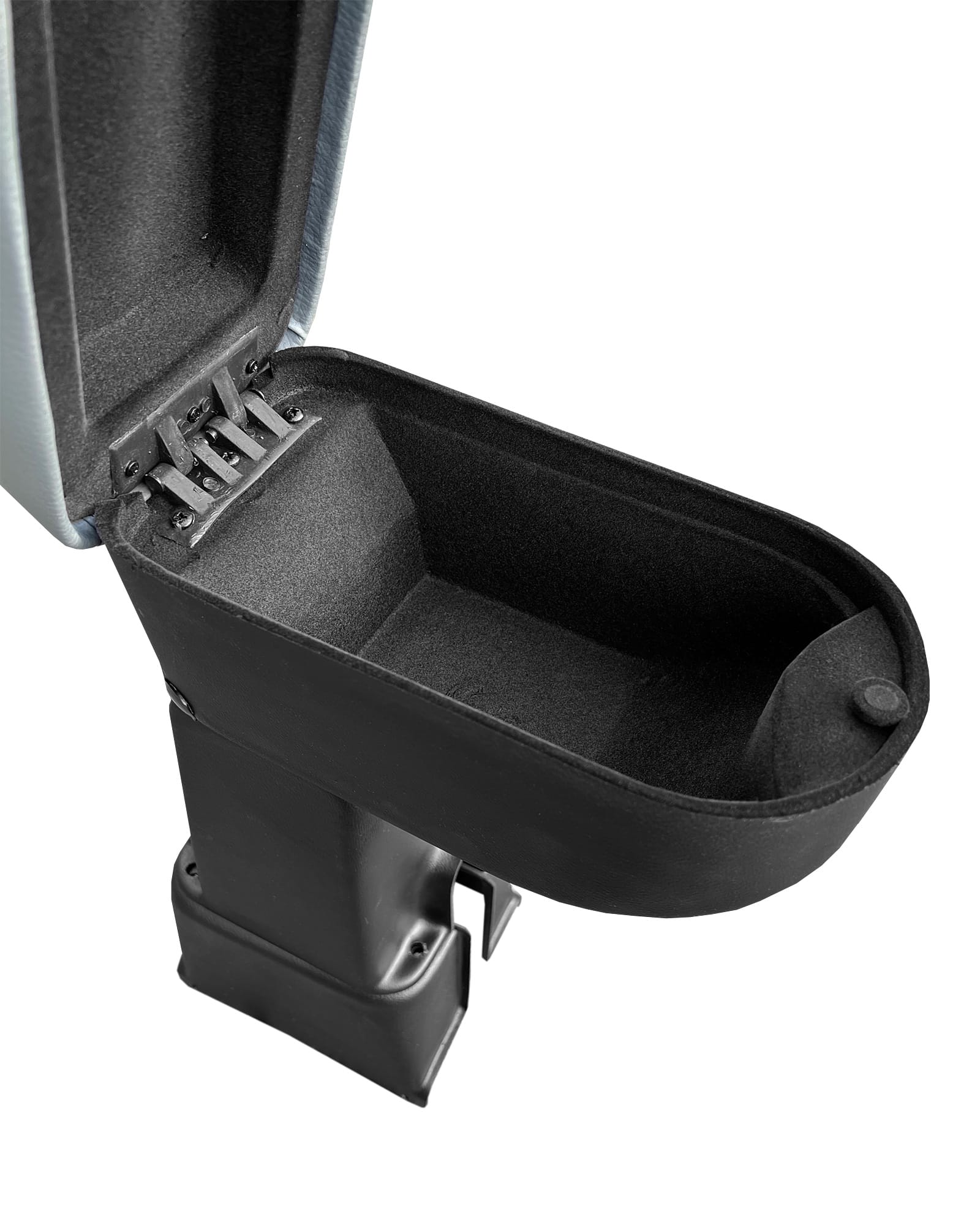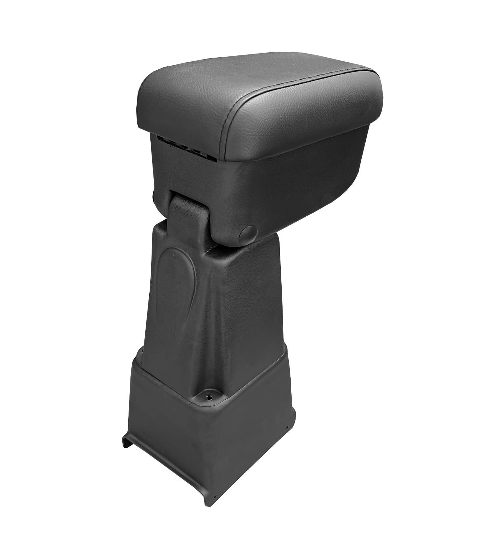 Podłokietnik ze stałym oparciem do samochodu RENAULT SCENIC I, prod. od 1997>, wykonany jest z czarnego perforowanego tworzywa ABS, posiada oparcie obszyte czarną wytrzymałą na ścieranie skórą syntetyczną oraz praktyczny otwierany schowek, wykończony czarnym, miękkim flokiem. Podłokietniki występują z adapterem montażowym  2 elementowym, który można odchylić do pionu.